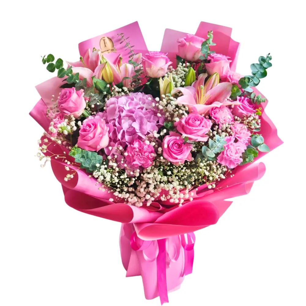 A soft, romantic masterpiece, Blush Delight features a luxurious blend of imported hydrangeas, premium imported roses, and fragrant stargazers, creating a stunning harmony of elegance and charm. Each bloom is thoughtfully arranged to highlight its natural beauty—hydrangeas offering fullness and grace, roses adding classic sophistication, and stargazers bringing a captivating touch of drama. Accented with delicate gypsophila and fresh eucalyptus, this bouquet radiates a gentle, dreamy allure perfect for celebrating love, gratitude, or life’s sweetest moments.