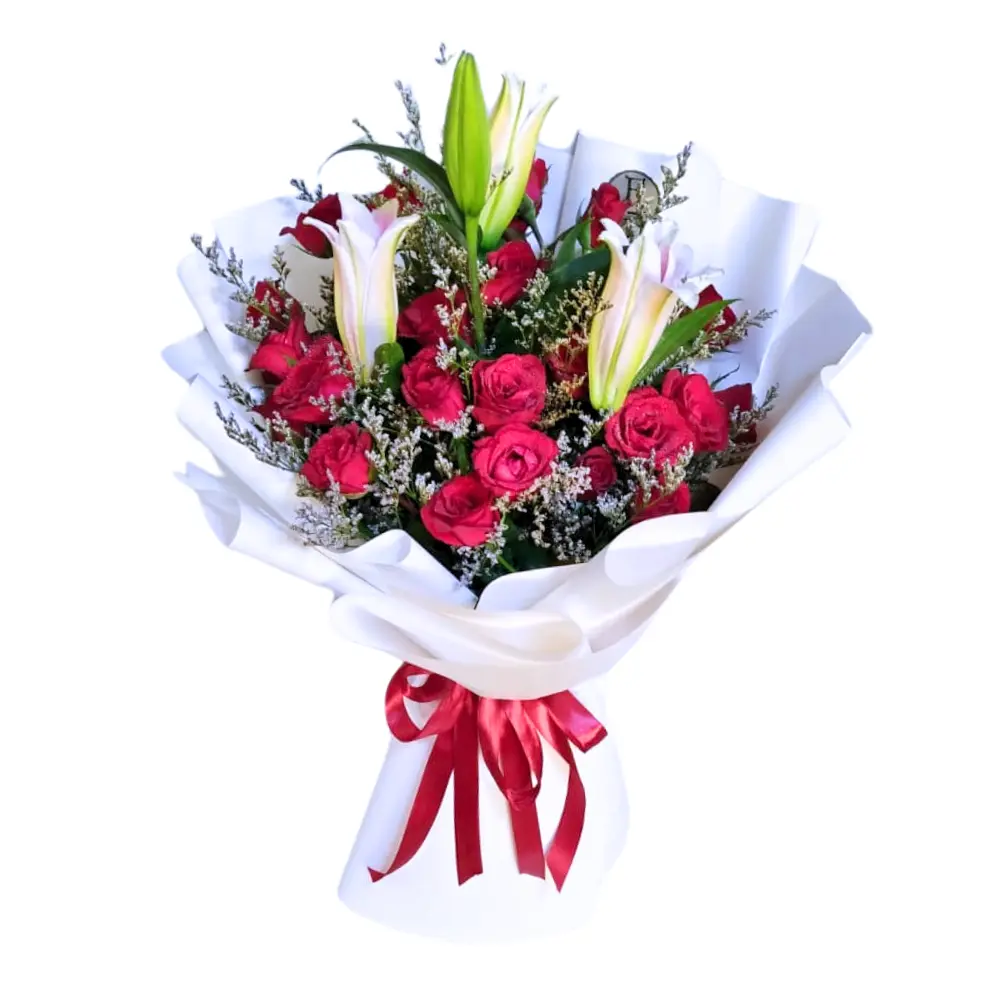 Elegant and captivating, the Lisette Bouquet is designed to leave a lasting impression. Featuring 24 classic red roses and radiant white stargazer lilies, this bouquet beautifully blends passion and purity. Accented with soft, cloud-like misty filler, it offers a graceful touch of texture and charm.