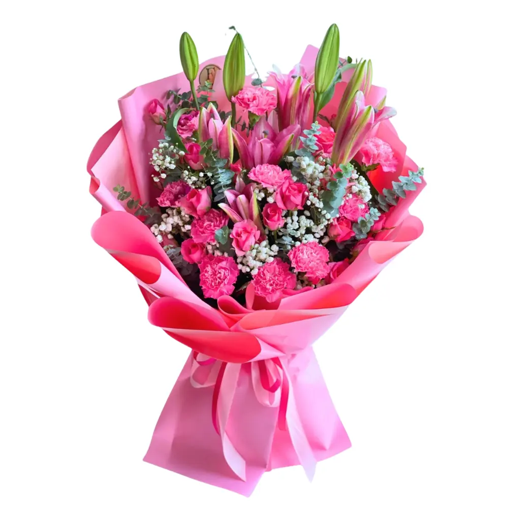 + Free Shipping 799 UpGraceful, lush, and beautifully bold, the Mirabella Bouquet is a grand expression of femininity and charm. This stunning arrangement features a luxurious bundle of imported pink stargazer lilies, surrounded by delicate white gypsophila, eucalyptus, and elegant pink carnations.