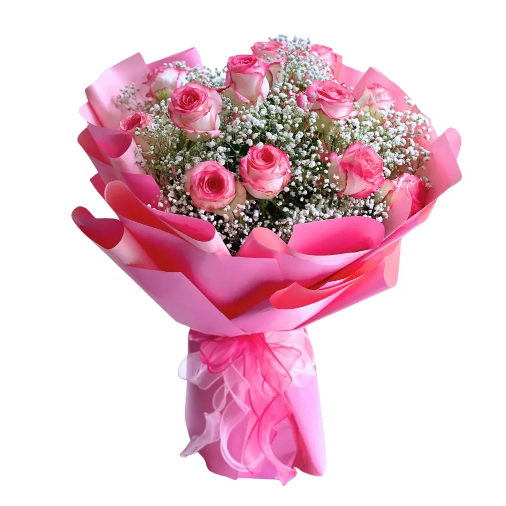Soft, dreamy, and wonderfully romantic, Pink Stardust features 12 imported pink roses paired with delicate million stars for a celestial, sparkling touch. Each rose blooms with gentle charm, while the airy fillers create a light, starry effect—like a sky sprinkled with pink stardust. Perfect for celebrating love, admiration, and life’s prettiest moments.