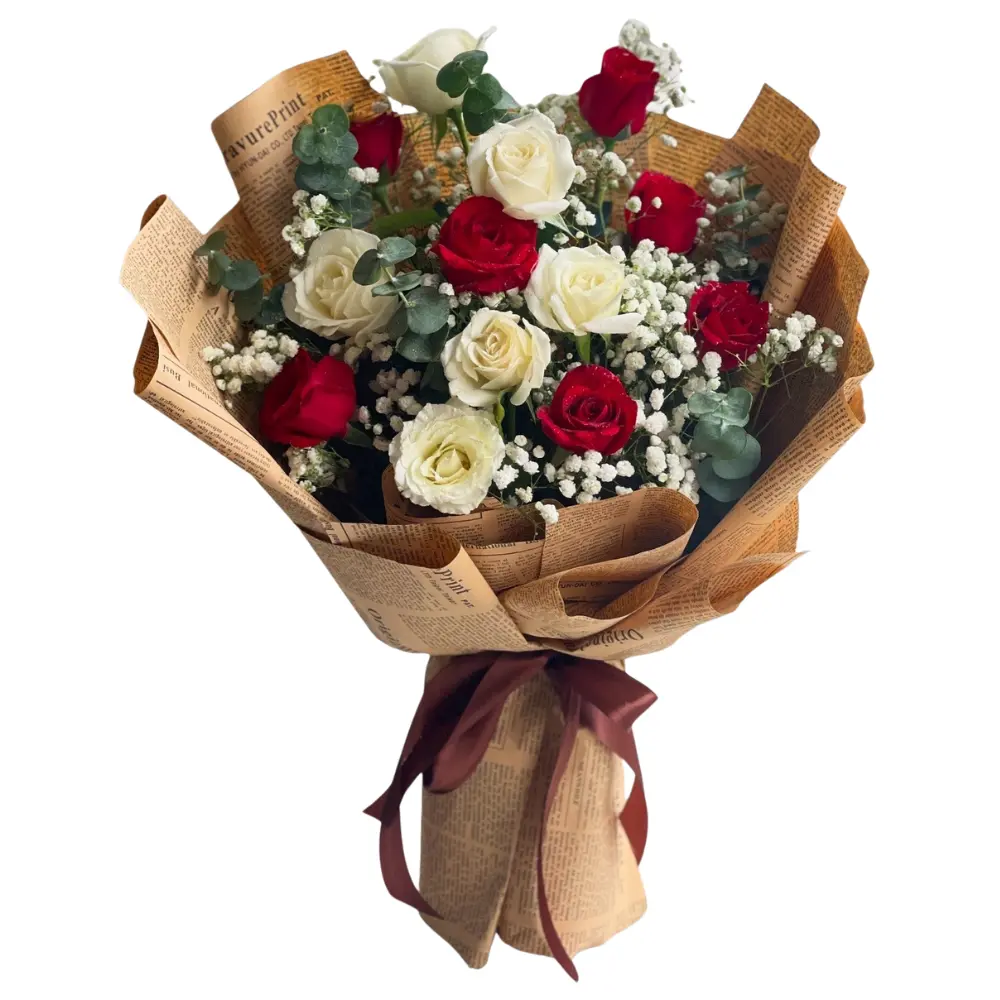 Soft, graceful, and timeless, Solène brings together 16 local red and white roses beautifully balanced with airy gypsophilia. Each bloom is arranged to highlight the contrast between passionate red and pure white, symbolizing love, sincerity, and harmony. Wrapped in a warm brown kraft wrap, this bouquet carries a natural, understated elegance—perfect for heartfelt occasions, romantic gestures, or simply expressing genuine affection