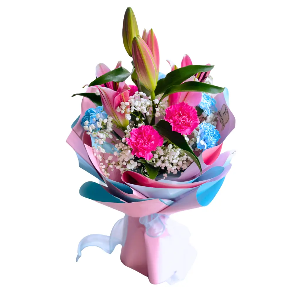 + Free Shipping 799 UpA stunning Starlight mix of soft pink and blue carnations paired with radiant stargazers, delicately accented by million stars fillers. This bouquet beautifully balances elegance and charm perfect for any celebration.