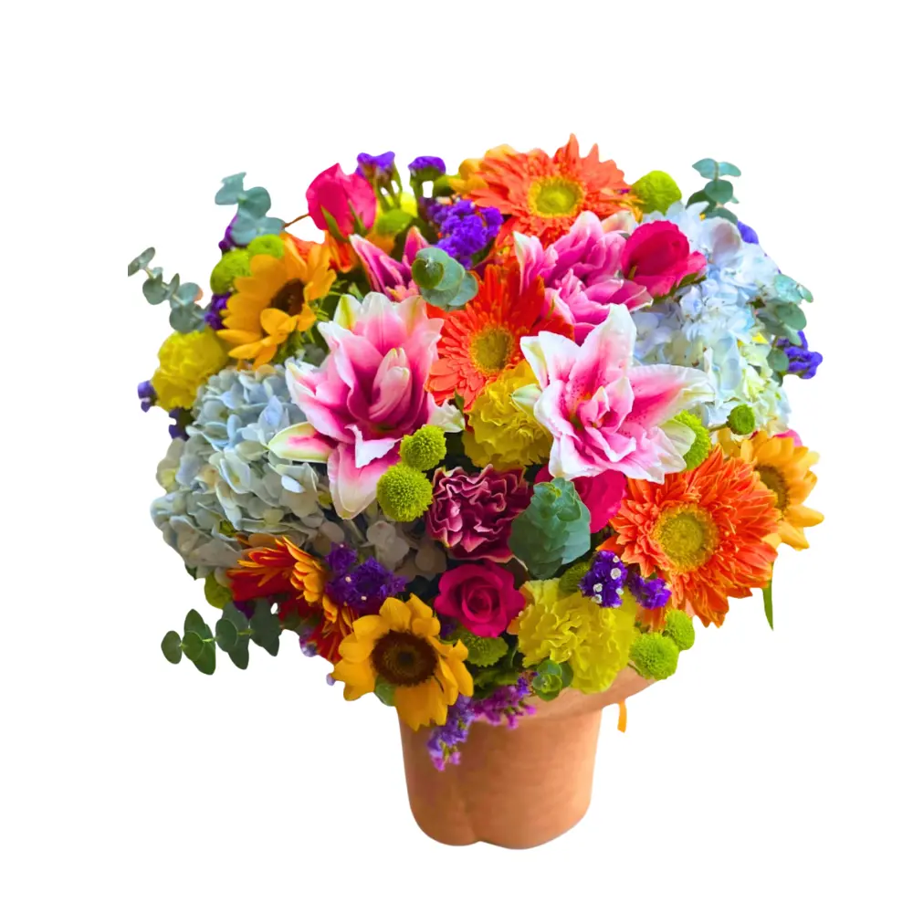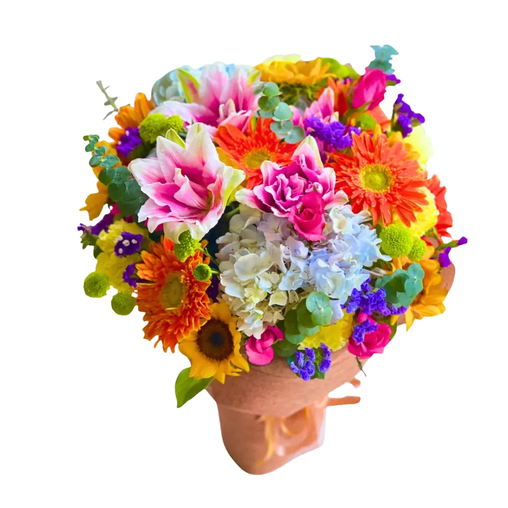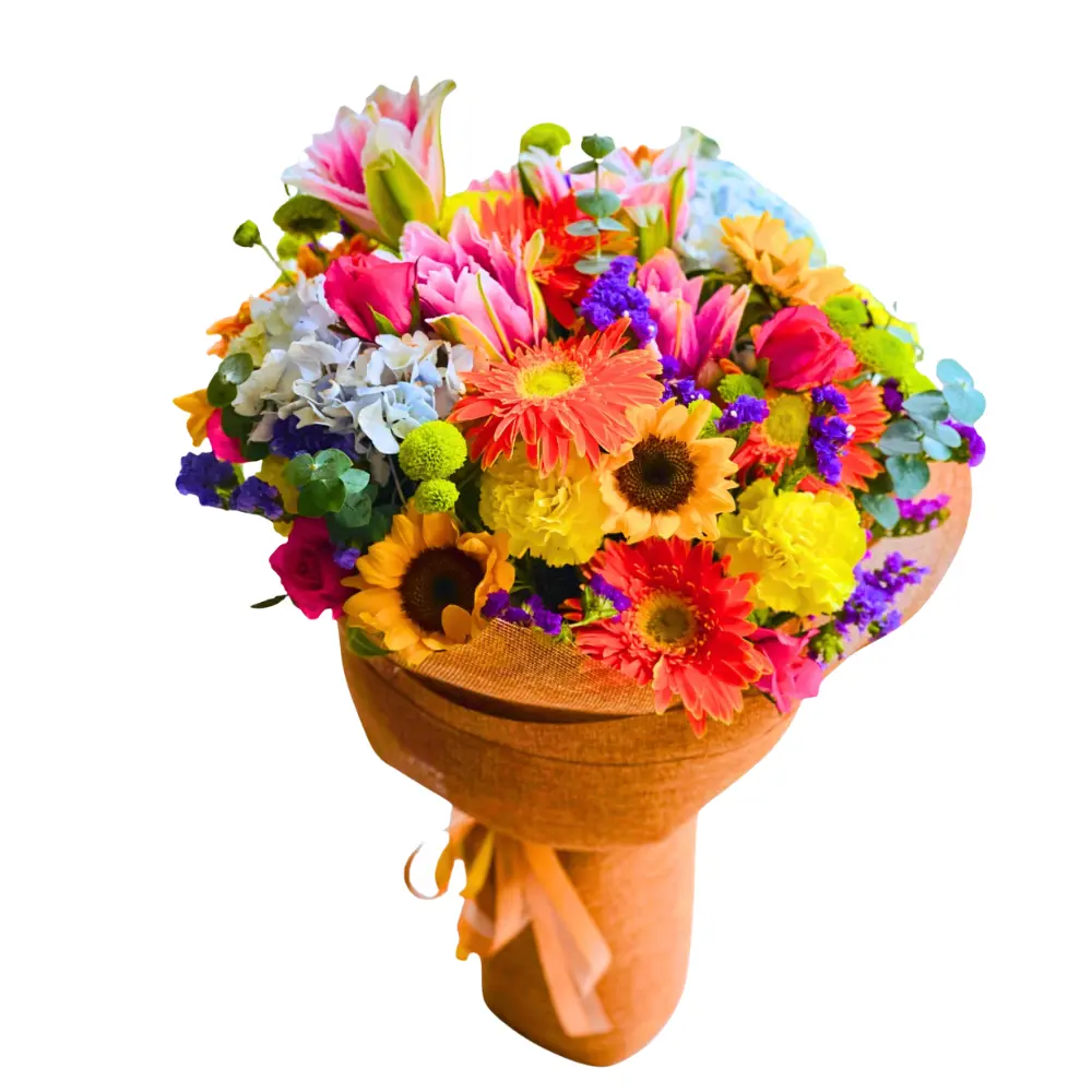 + Free Shipping 799 UpA charming burst of sunshine and color, the Thumbelina Bouquet is a delightful mix of sunflowers, gerberas, carnations, hydrangeas, and statice — thoughtfully arranged to capture warmth and joy in every bloom. The sunflowers bring radiant cheer, gerberas add playful vibrance, carnations offer soft romance, while hydrangeas lend fullness and elegance. Accented with statice for a touch of texture and lasting beauty, this bouquet is perfect for brightening someone’s day or celebrating life’s little joys.